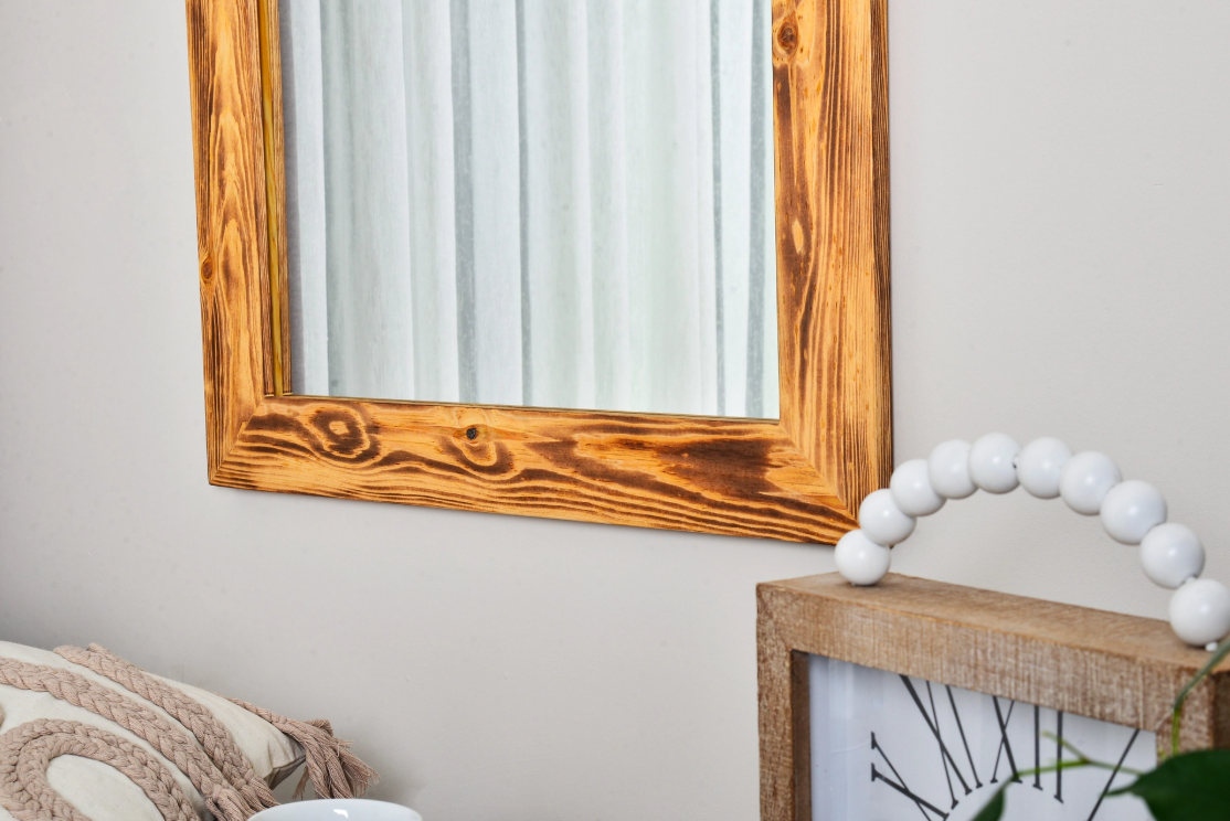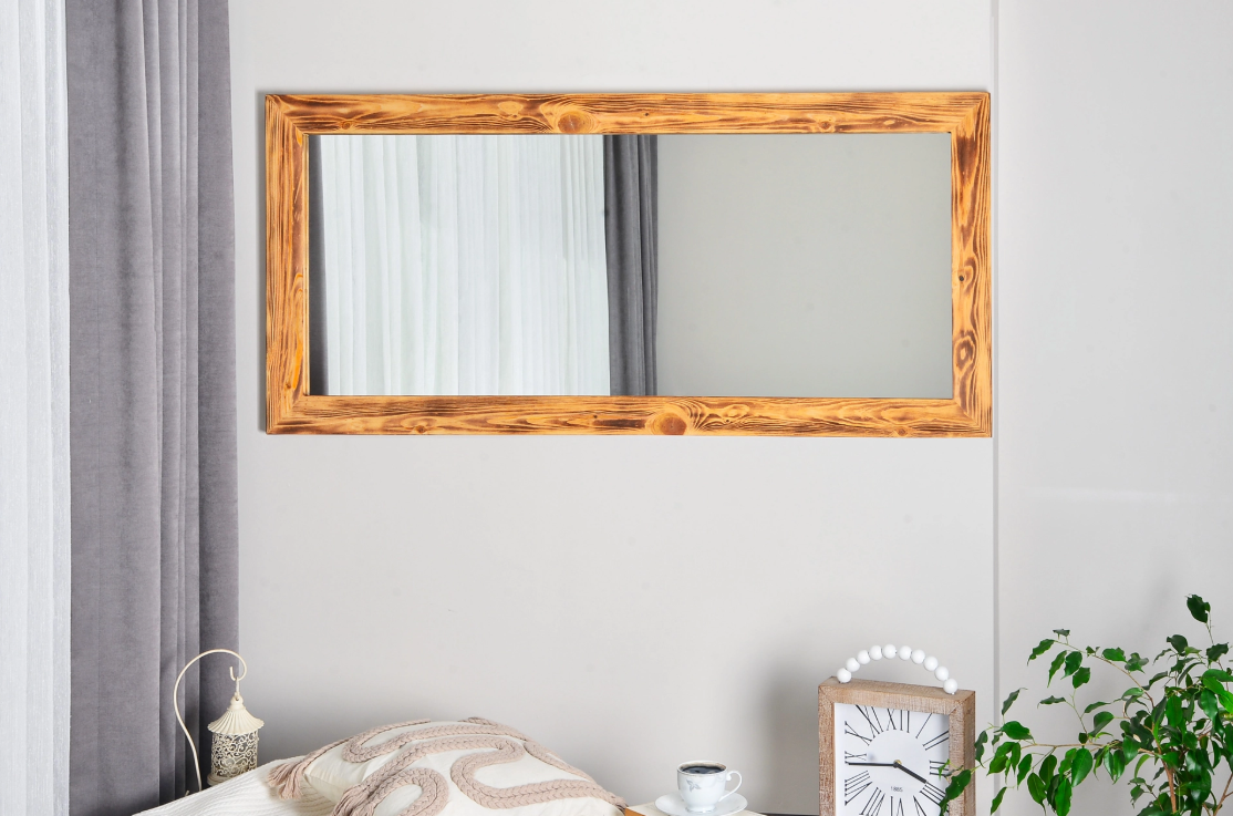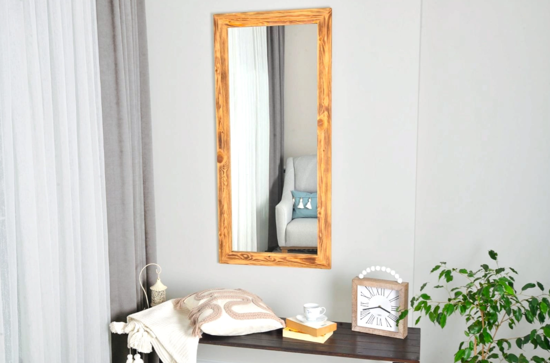 Ek Bilgiler: Doğal ahşaptan tamamen el işçiliği ile üretilmiştir. Ürüne yakma işlemi uygulanarak ahşabın doğal deseni ortaya çıkarılmıştır. Salon, yatak odası, antre dilediğiniz mekanda kullanabilirsiniz. Ürünü yatay olarak konsol aynası yada dikey olarak boy aynası şeklinde kullanabilirsiniz. Her iki şekil içinde uygun askı aparatları arkasında montelidir. 1. Sınıf şişecam doğa dostu (Bakırsız ve Kurşunsuz)Flotal ayna  kullanılmıştır. Flotal ayna daha net, parlak ve derin görüntü sağlar. Askı aparatı arkasında montelidir. Paket içerisinden çıkan dübel ve vida ile duvara asılabilir. Aynası monteli olarak gönderilmektedir, herhangi bir kuruluma gerek yoktur.