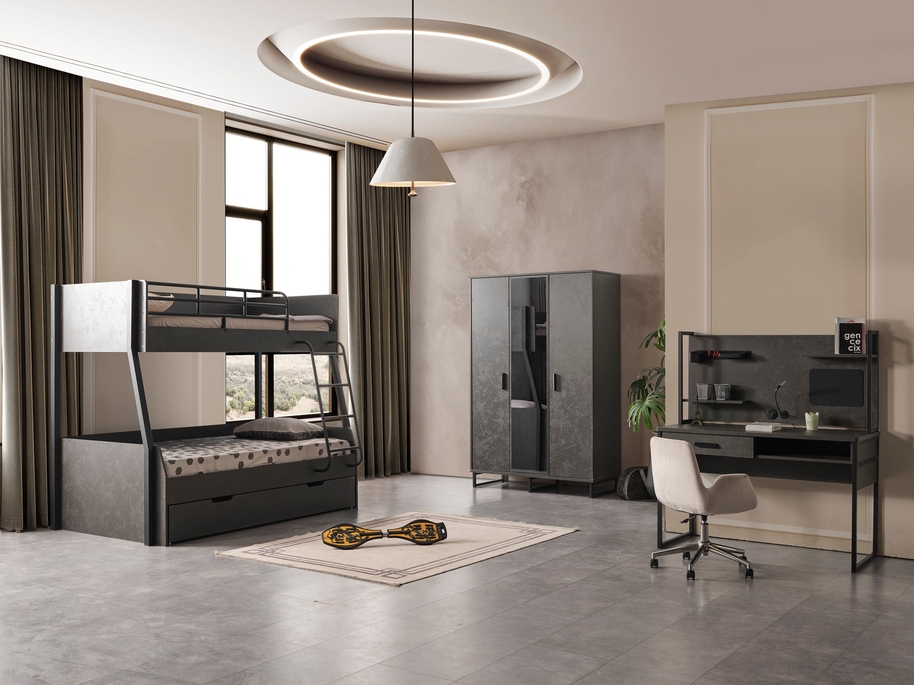 Takım İçeriği: 1 adet karyola(100x200), Üç kapılı dolap ve 1 adet çalışma masası